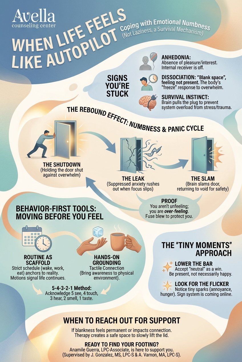 If you are oscillating between feeling nothing and feeling sudden anxiety, therapy can help. In counseling, we don't force the door open. We create a safe environment to slowly lift the lid on the vacuum so emotions can be processed gradually, rather than rushing out as panic.