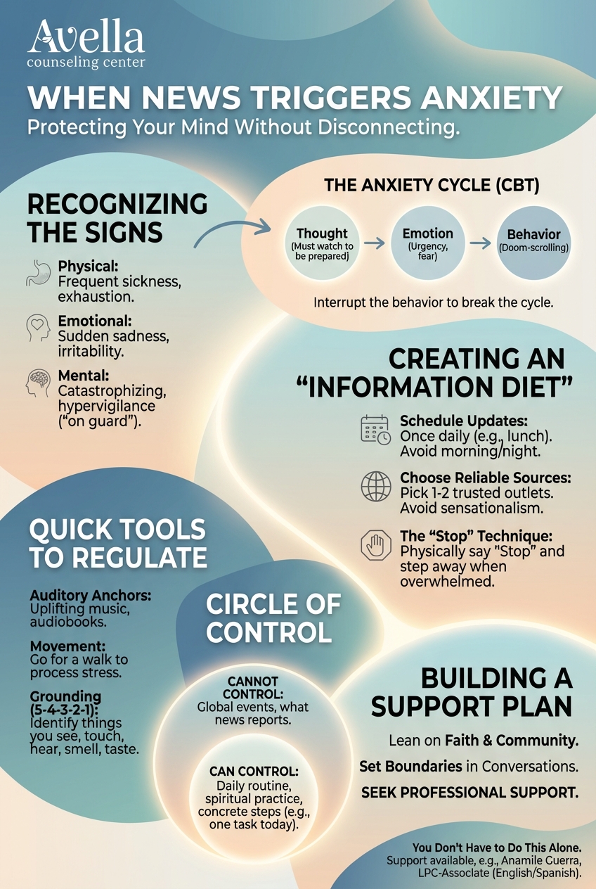 In our Pearland therapy practice, we often hear from people who feel a sudden shift in their mood after watching the news. You might be going about your day, feeling okay, and then one headline triggers a spiral of worry. It is not just "being sensitive." It is your body responding to a perceived threat.