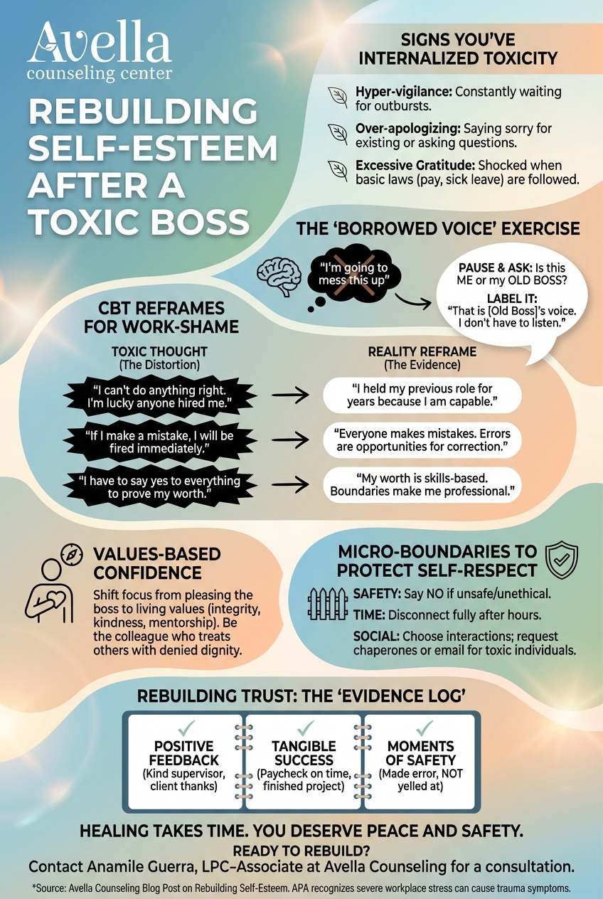In therapy, we call this the Borrowed Voice. The negative thought in your head isn't actually yours; it is a recording of your old boss.